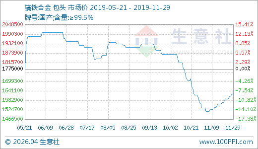 11月份国内稀土市场价格涨跌互现,受国内政策影响,国内重稀土市场价格不断上涨,轻稀土市场价格持续走低。根据生意社稀土板块指数显示,11月29日稀土指数为336点,与昨日持平,较周期内最高点1000点(2011-12-06)下降了66.40%,较2015年09月13日最低点271点上涨了23.99%。(注:周期指2011-12-01至今)。